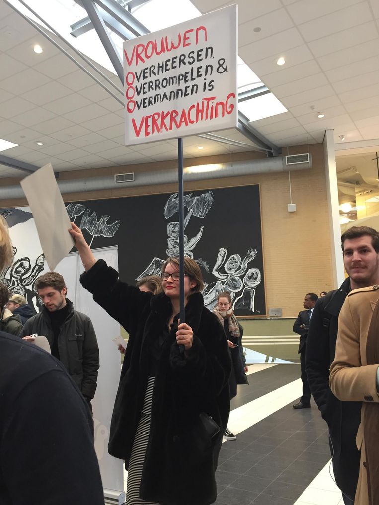 Een andere student die op eigen titel demonstreert is niet tegen de komst van Baudet, maar vindt het belangrijk een tegengeluid te laten horen. Tijdens het gesprek houdt ze een bord omhoog met 'vrouwen overheersen, overrompelen & overmannen is verkrachting'.